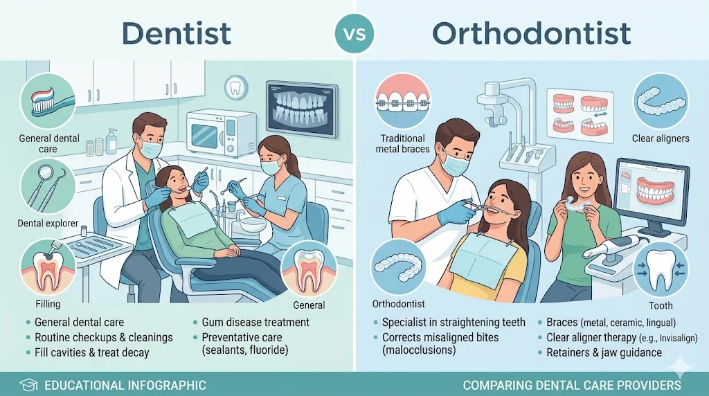 Posted inGrammar Dentist vs Orthodontist: Key Differences, Roles and Treatments Explained (2026) Posted by Kevin Brooks April 22, 2026 The difference between a dentist and an orthodontist is based on their training and the…